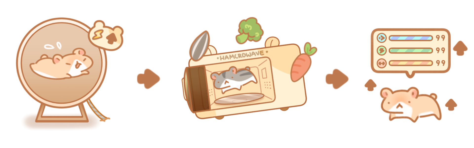 Power up your hamsters by putting them on wheels to generate electricity, which fuels the hamcrowave to cook food. Feed your hard-working hamsters to improve their stats or even recruit more to join the team!